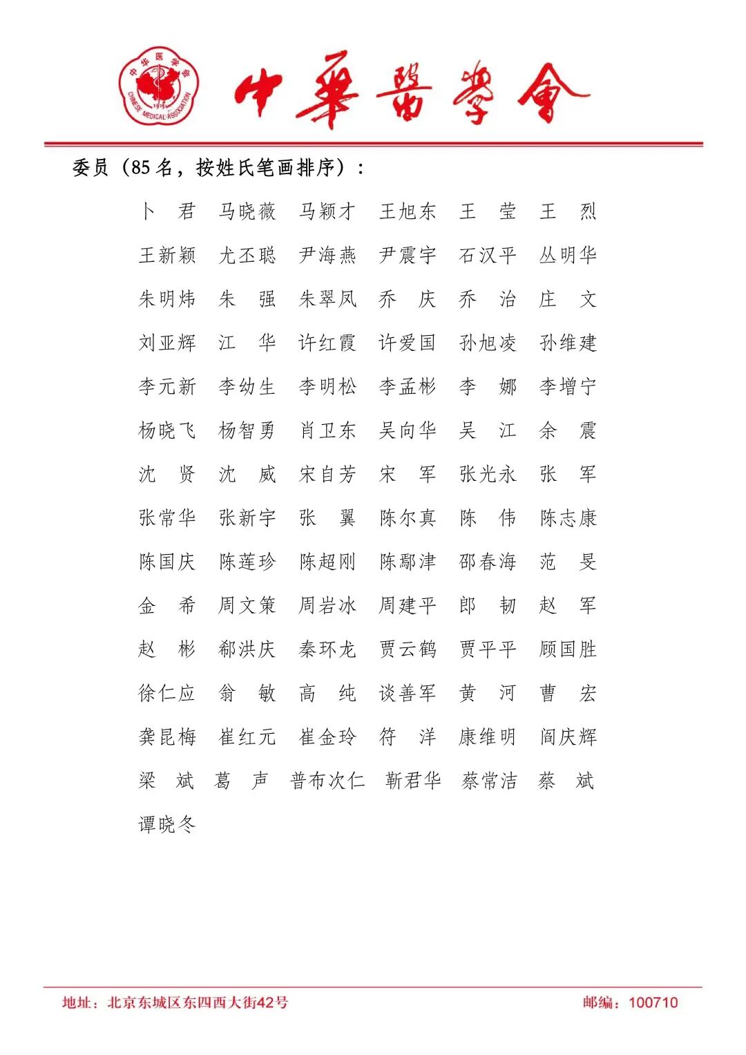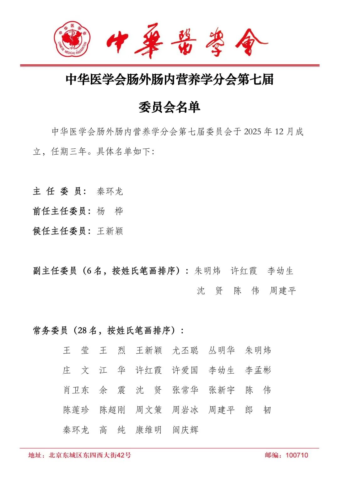 名单显示,中华医学会肠外肠内营养学分会第七届委员会由苏州市立医院秦环龙教授担任主任委员,重庆市人民医院杨桦教授担任前任主任委员,东部战区总医院王新颖教授担任候任主任委员,北京医院朱明炜教授、陆军特色医学中心(大坪医院)许红霞教授、上海交通大学医学院附属第九人民医院李幼生教授、温州医科大学附属第一医院沈贤教授、中国医学科学院北京协和医院陈伟教授、中国医科大学附属第一医院周建平教授担任副主任委员。本届委员会常务委员共28名,委员共85名。