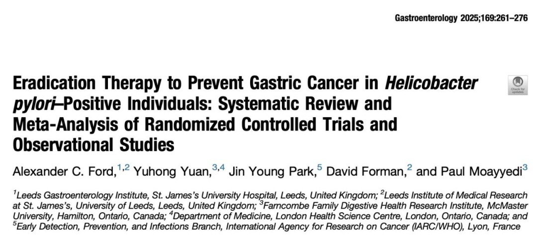 胃癌是全球第五大常见癌症。Alexander C. Ford团队曾在2020年发表了关于根除幽门螺杆菌(Hp)预防胃癌的荟萃分析,结果提示,在普通人群中进行Hp的筛查和治疗能够降低未来患胃癌的风险,但当时所纳入研究的证据等级还相对较低。鉴于近年来有不少关于根除Hp预防胃癌的新证据,团队对此前的荟萃分析进行了更新,并在纳入随机对照试验(RCT)的基础上,也纳入了观察性研究。
