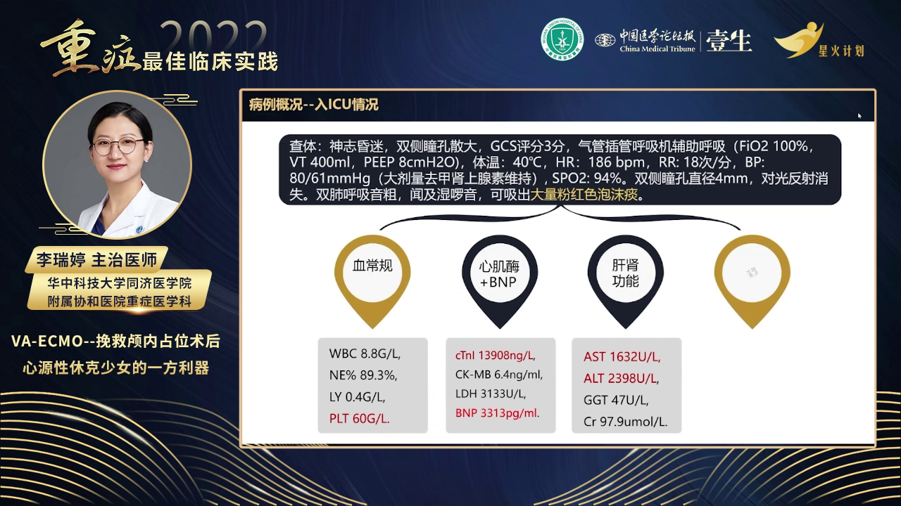 针对患者肺水肿和ARDS状态,采用小潮气量、肺保护通气和肺复张策略以改善氧合、防止肺进一步损伤;使用血管活性药物维持循环稳定,给予经验性抗感染治疗,纠正电解质紊乱,采用胺碘酮联合艾司洛尔进行抗心律失常治疗。然而,患者心源性休克严重,大剂量血管活性药物维持下血压仍未达理想水平,此时能否尝试VA-ECMO治疗成为关键问题。一方面,患者经历两次颅脑大手术且术区有出血灶,瞳孔散大、对光反射消失,实施ECMO治疗效果存疑;另一方面,参考2020年发表的相似病例,该29岁女性孕10周,因发热、头痛等症状入院,出现呼吸心跳骤停,心脏射血分数仅10% ,紧急启动VA-ECMO治疗后射血分数快速恢复,最终神经功能也恢复至CPC一级水平。基于此,决定对当前患者启动VA-ECMO治疗。