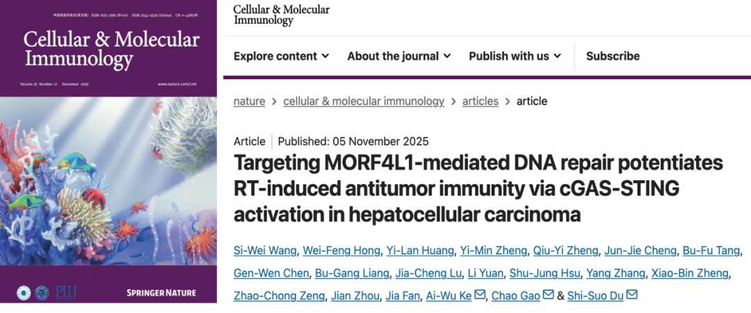 近日,复旦大学附属中山医院放疗科杜世锁教授团队联合复旦大学(中山医院)肝癌研究所柯爱武副研究员团队,在曾昭冲教授悉心指导下取得创新突破。该研究系统阐明MORF4L1在肝癌放疗抵抗中的关键作用机制,创新提出阿加曲班联合放疗及免疫治疗的“精准调谐”方案。相关成果以封面文章发表于国际免疫学权威期刊《Cellular & Molecular Immunology》(JCR Q1,IF=19.4),获国际同行专题述评高度认可,为破解肝癌治疗难题提供重要的理论依据。