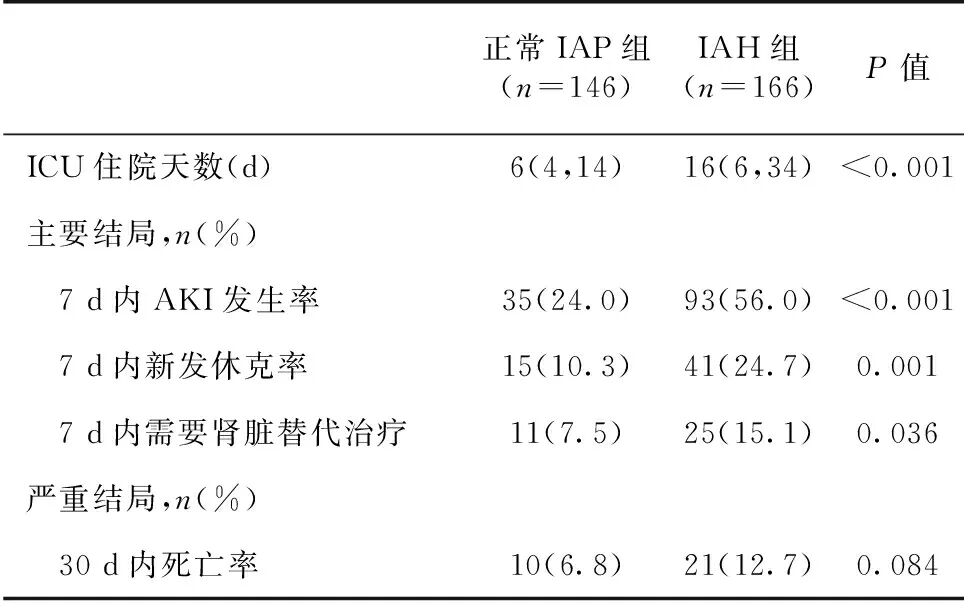 IAP对其他临床结局的影响 IAP与AKI发生相关,同时也与7 d内新发休克率和入院7 d内需要肾脏替代治疗相关,同时IAH患者的ICU住院天数更长(表4)。
