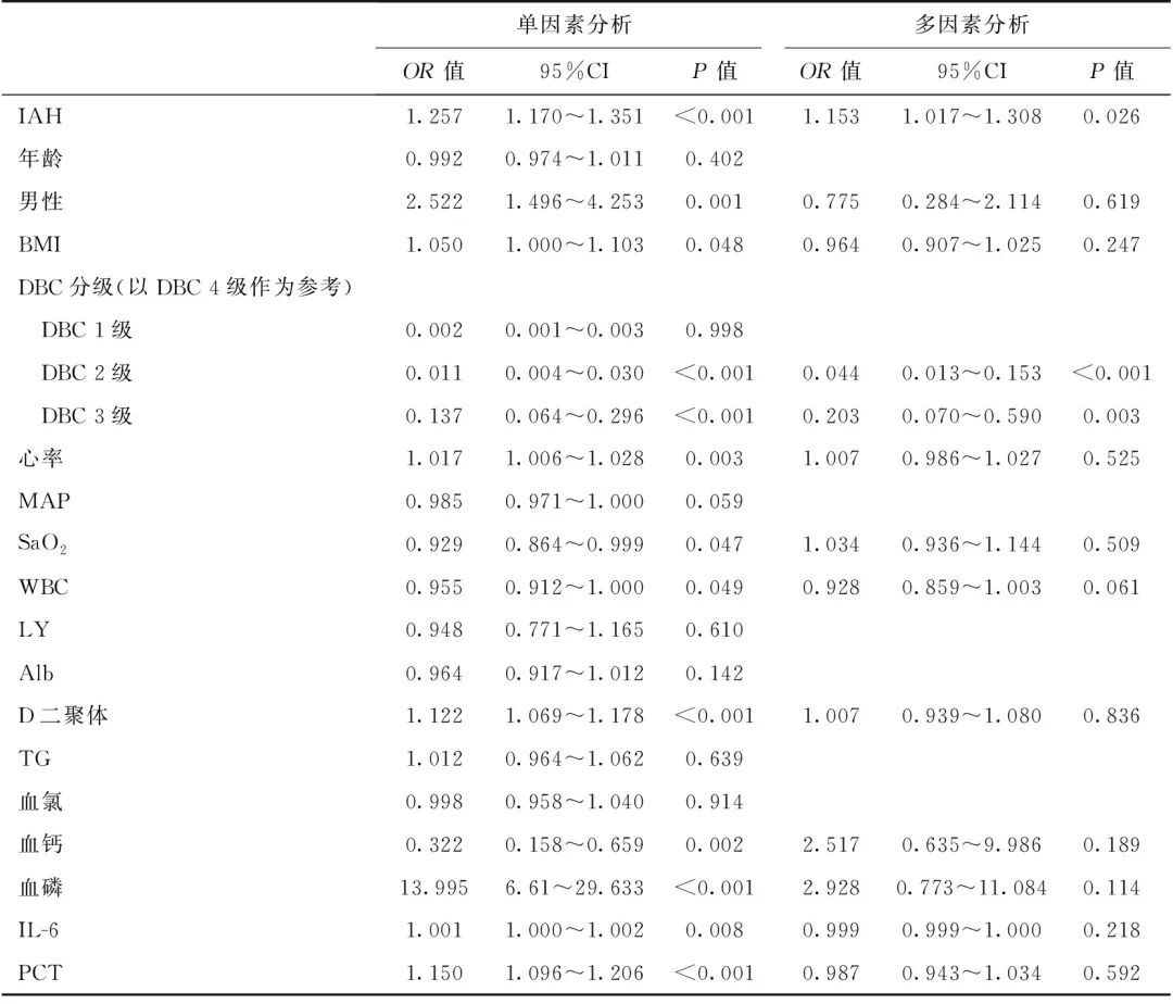 IAH:腹腔内高压;BMI:体质量指数;DBC:急性胰腺炎严重程度;MAP:平均动脉压;SaO2:外周血氧饱和度;WBC:白细胞计数;LY:淋巴细胞计数;Alb:血清白蛋白;TG:三酰甘油;IL-6:白细胞介素6;PCT:降钙素原