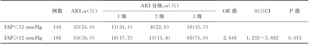 IAP水平对AKI的影响 根据入院首次IAP测量结果划分为正常IAP组(<12 mmHg)146例(46.8%)和IAH组(≥12 mmHg)166例(53.2%),两组患者AKI发生率分别为35例(24.0%)和93例(56.0%),具有显著统计学差异(P=0.013)。通过有序Logistic回归分析IAP对急性胰腺炎患者AKI分级的影响,如表2所示,IAP升高对AKI分级的升高具有显著影响,IAH患者发生更高等级AKI的风险是IAP正常患者的2.646倍(95%CI 1.232~5.682)。