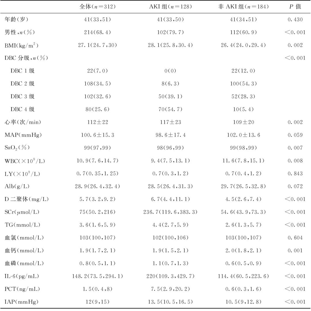 基线数据 最终纳入312例患者,基线数据如表1所示。与非AKI组相比,AKI组的IAP(P<0.001)和BMI(P=0.002)较高;在实验室指标方面,AKI组有较高水平的WBC(P=0.008)、D二聚体(P<0.001)、三酰甘油(P<0.001)、血磷(P<0.001)、IL-6(P<0.001)和PCT(P<0.001),有较低水平的血钙(P=0.001)。