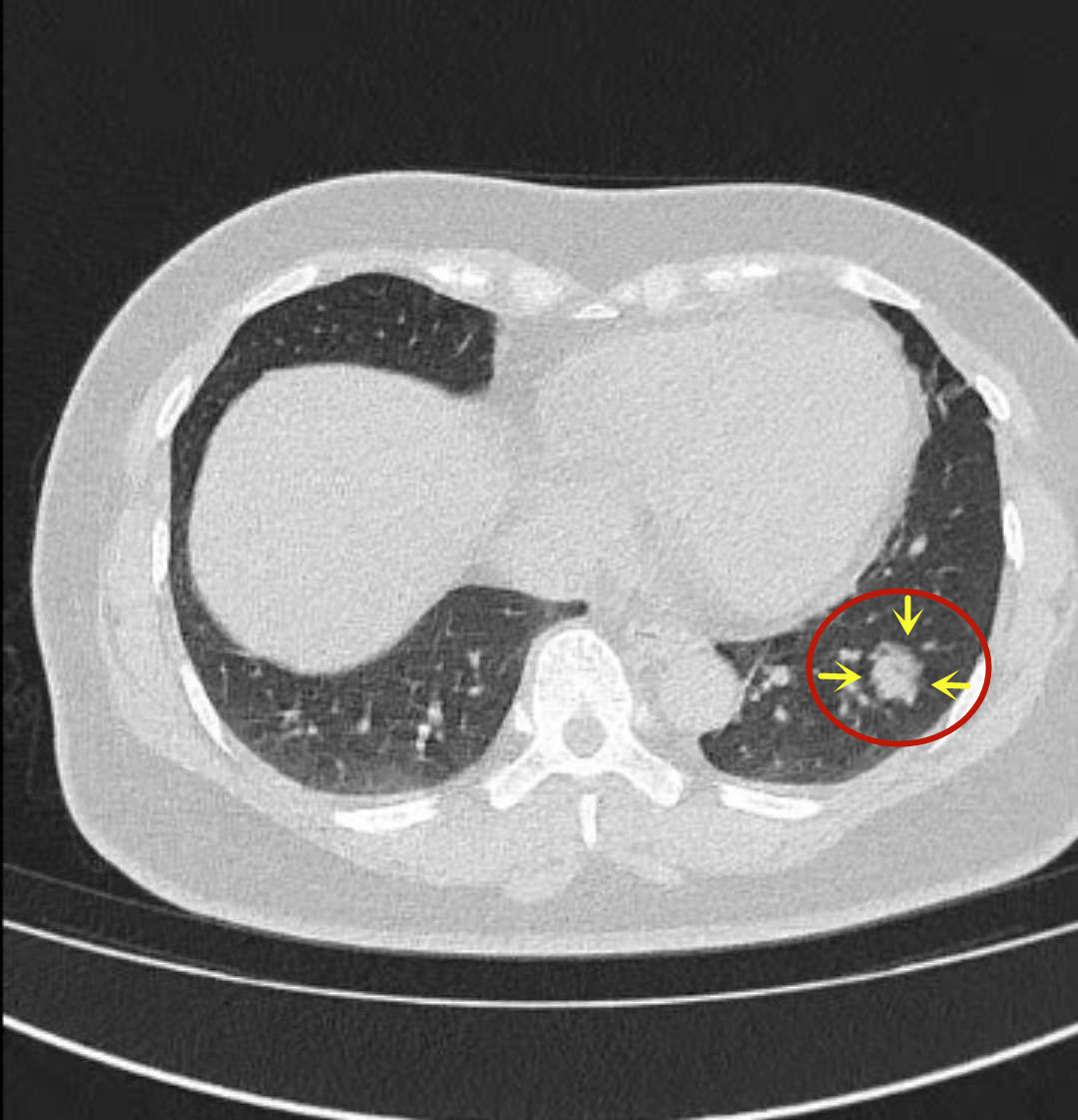 患者,女性,47岁,因“检查发现左肺结节1月余”入院。无咳嗽、咳痰、发热或胸闷、气促等症状。查体:体温36.5℃,脉搏97次/分,血压148/88 mmHg,心率97次/分,神志清,颈软,两肺呼吸音清,未闻及明显啰音,心脏听诊未及明显杂音,腹平软,肝脾肋下未及,四肢活动好,全身浅表淋巴结未及明显肿大。血常规、肝肾功能、肿瘤筛查(肺癌系列)、凝血功能等未见明显异常。