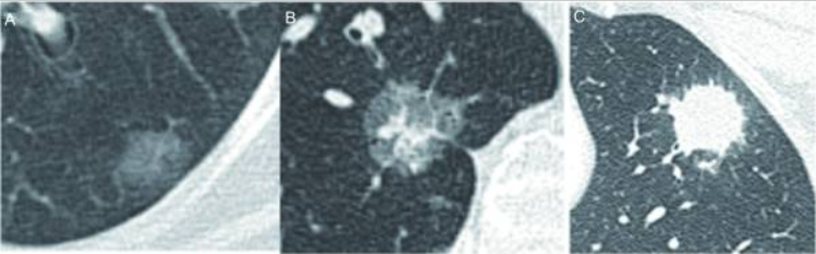 肺结节的密度分类。A(左):磨玻璃结节;B(中):部分实性结节;C(右):实性结节。图源:《中国肺部结节分类、诊断与治疗指南(2016年版)》