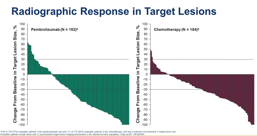 化疗组一共有56例(36%)在疾病进展后交叉到帕博利珠单抗单抗组接受治疗;另外有35例患者接受了研究之外的其他PD-1或PD-L1单抗治疗,因此,意向治疗(ITT)人群中一共59%患者接受了有效的交叉治疗。