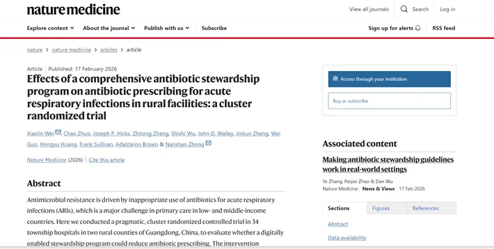 2026年2月17日,实验室钟南山院士/卓超教授团队与加拿大多伦多大学魏晓林教授团队及广东粤北人民医院郑锦坤主任药师共同合作在国际知名期刊 Nature Medicine 发表题为“Effects of a comprehensive antibiotic stewardship program on antibiotic prescribing for acute respiratory infections in rural facilities: a cluster randomized trial”的研究成果,为抗菌药物滥用这一难题提供了可复制、可推广的“中国基层卫生管理方案”。该研究历时7年,在广东省两个农村县的34家乡镇医院开展,成功将急性呼吸道感染的抗菌药物处方率从71%降至26%,且未增加患者安全风险。