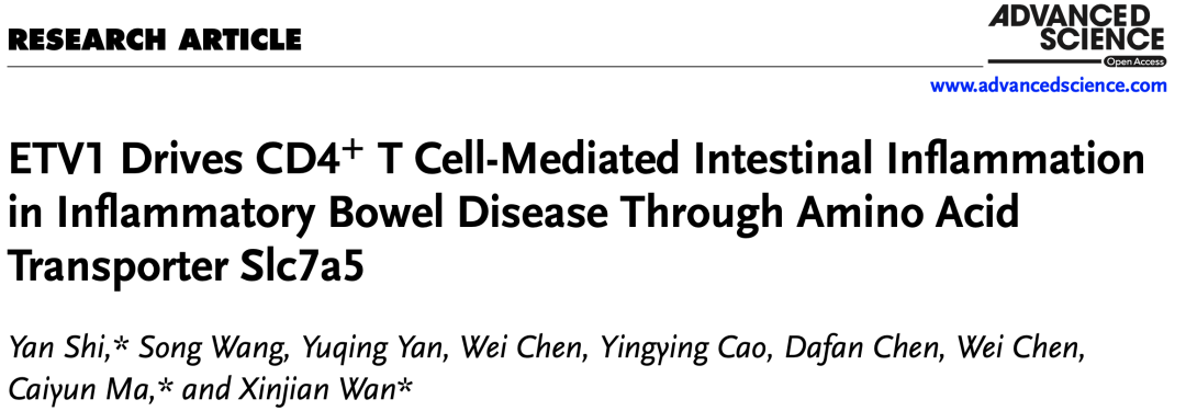 近日,上海市第六人民医院消化内科宛新建教授团队在Advanced Science(IF=14.1)在线发表题为“ETV1 Drives CD4⁺ T Cell-Mediated Intestinal Inflammation in Inflammatory Bowel Disease Through Amino Acid Transporter Slc7a5”的研究论文。该研究系统阐明,转录因子ETV1通过直接靶向调控氨基酸转运蛋白SLC7A5,驱动CD4⁺T细胞的代谢重编程与功能活化,进而促进肠道炎症发生,为炎症性肠病(IBD)的精准靶向治疗提供了新的理论依据与干预策略。