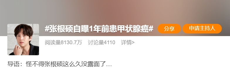 日前,话题#张根硕自曝1年前患甲状腺癌#冲上热搜。