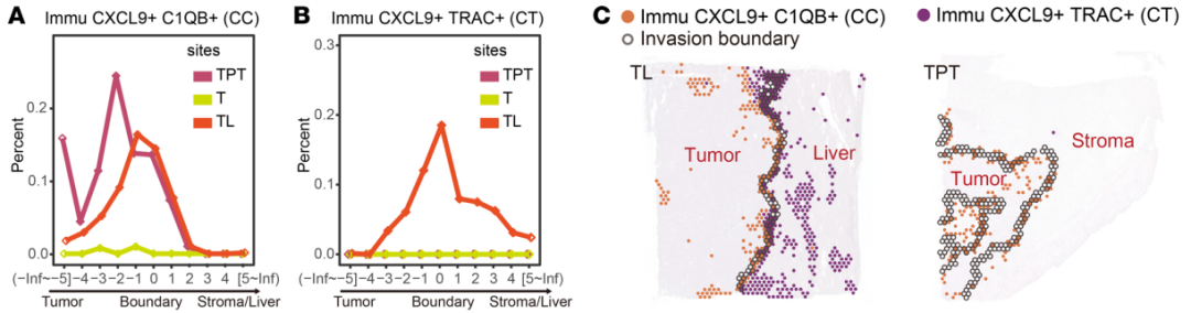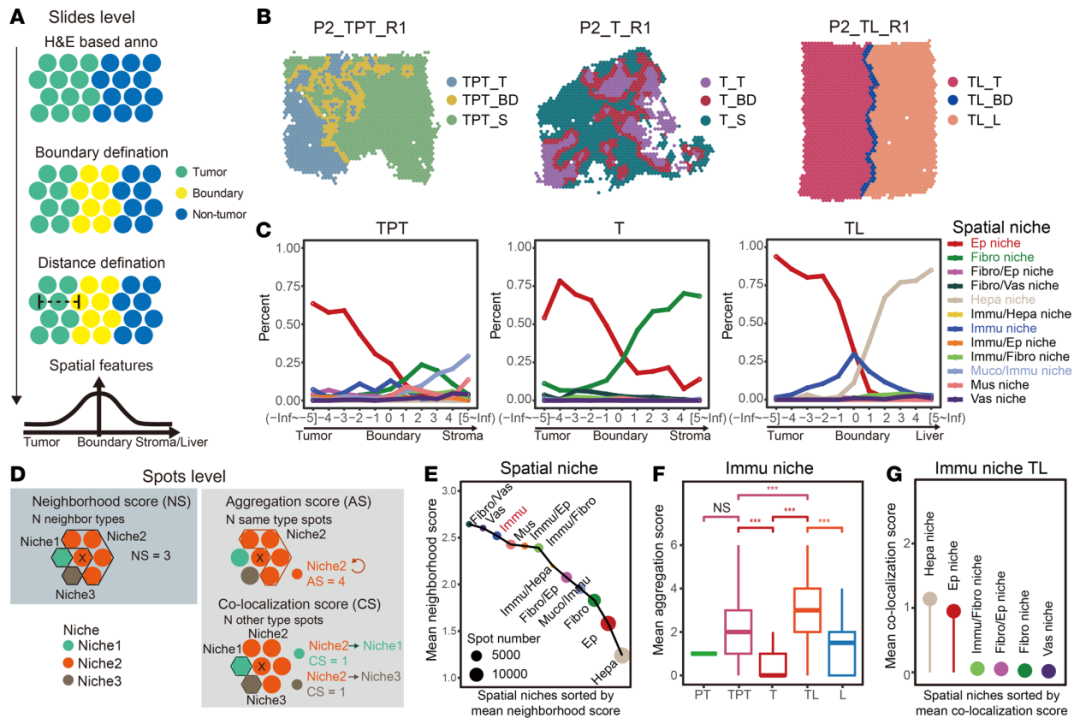 为破解这一临床科研瓶颈,该研究团队对8例伴有肝脏侵犯的胆囊癌患者进行多区域取样,结合单细胞RNA测序、10xVisium以及10xVisium HD等空间转录组技术,全面刻画从肿瘤核心、肿瘤-肝脏侵犯交界区直至正常肝组织的细胞构成空间梯度。团队还自主开发空间位置分析工具POSST,实现对微环境中各细胞分布特征的精准定量描绘,清晰揭示肿瘤-肝脏边界处的细胞动态变化规律。