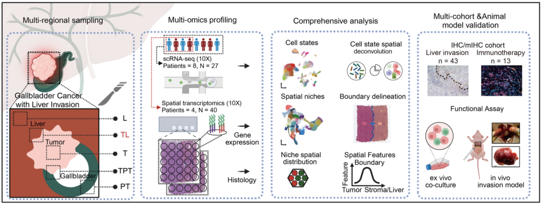 胆囊癌是胆道系统中侵袭性最强的恶性肿瘤之一,因解剖位置紧邻肝脏,极易发生直接肝侵犯,进而导致根治性手术范围扩大、手术难度显著提升、患者整体预后不良。肿瘤由胆囊原位侵犯至肝脏后,其生物学行为发生质的改变,临床治疗策略也需随之调整。尽管肝侵犯在胆囊癌中极为常见,但肿瘤—肝脏交界处微环境的细胞组成、空间架构及免疫调控机制,长期以来尚未得到系统阐明,成为制约胆囊癌诊疗突破的关键难题。