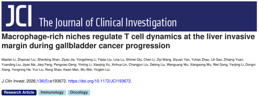 近日,上海交通大学医学院附属仁济医院刘颖斌、李茂岚团队联合临港实验室魏武团队、上海交通大学邵荣团队、香港大学万钧团队,在国际权威学术期刊《Journal of Clinical Investigation》发表题为《Macrophage-rich niches regulate T cell dynamics at the liver invasive margin during gallbladder cancer progression》的最新研究成果。该研究整合单细胞转录组与空间转录组技术,首次系统绘制胆囊癌肝侵犯微环境空间细胞图谱,揭示肿瘤-肝脏交界区域免疫细胞动态调控核心机制,为胆囊癌精准诊疗与免疫治疗创新提供全新思路。