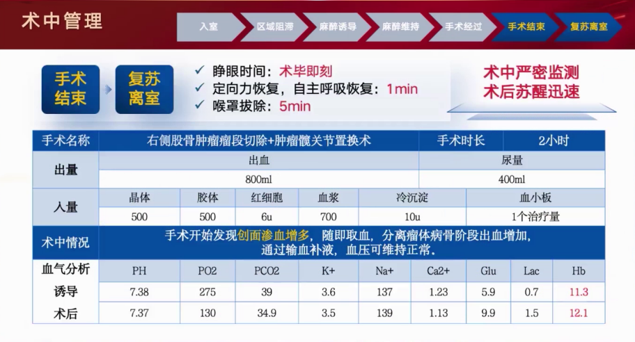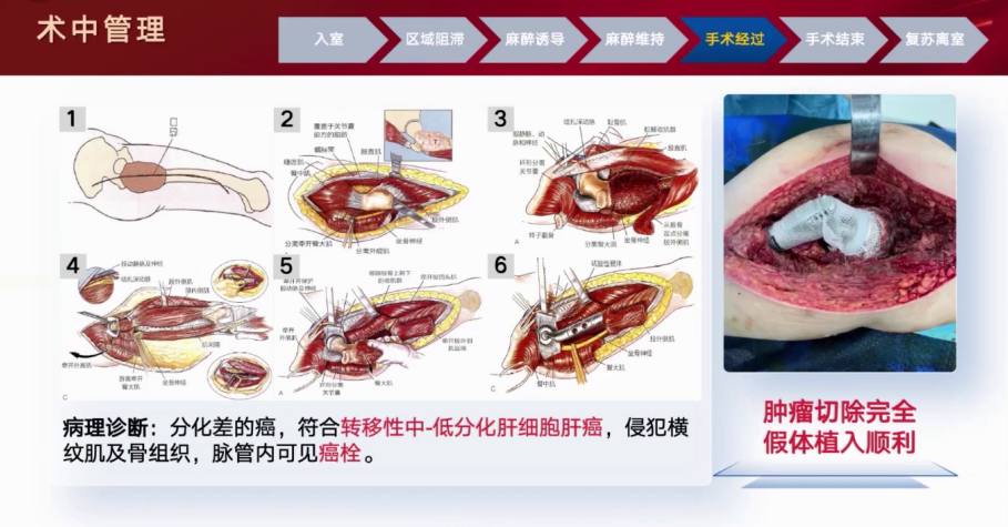 手术顺利完成右侧股骨肿瘤瘤段切除及肿瘤髋关节置换术,历时2小时。切口从大转子延伸到股骨中下段,截取瘤段20cm,病理回报为转移性中低分化肝癌,侵犯横纹肌及骨组织,脉管内可见癌栓。术中显露及分离瘤体时出血约800ml,通过有效止血、补液及补充血制品,维持了患者循环平稳、供氧充足和内环境稳定。缝皮时停止麻醉药物泵注,术后即刻睁眼,术后1分钟恢复自主呼吸和定向力,术后5分钟快速拔出喉罩。术后给予个性化止痛方案,将镇痛效果最大化,不良反应降至最低。患者术前VAS评分高达8-10分,术后3天未禁食,无并发症。术后7天出院,随访至术后15个月,患者可拄双拐行走,生活自理。