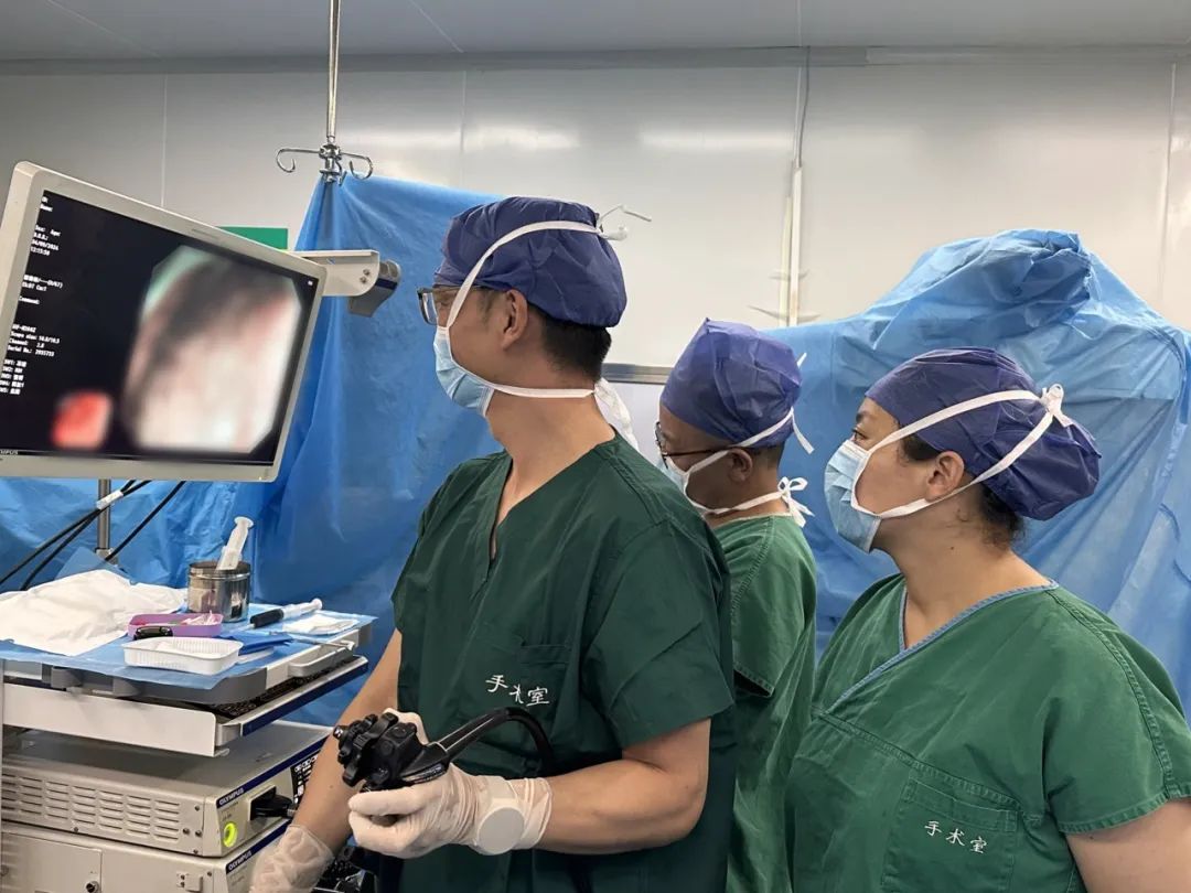 王强副主任医师(左一)带领团队为患者实施内镜黏膜下剥离术