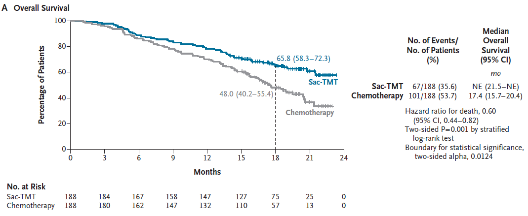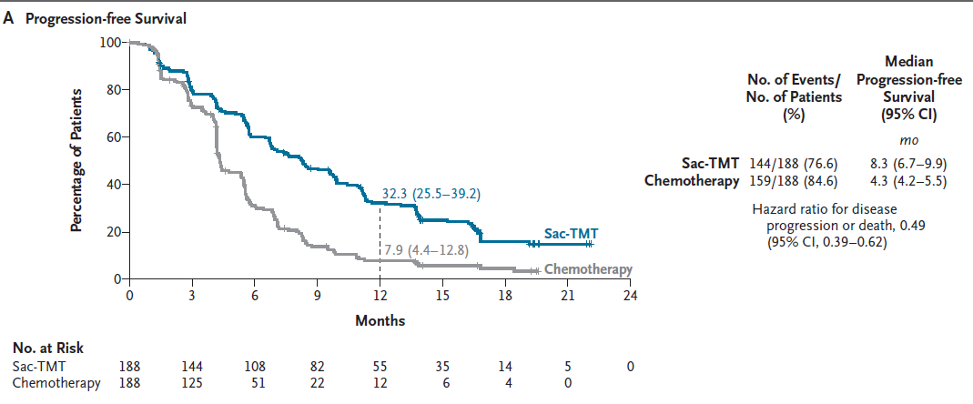 无进展生存期方面,芦康沙妥珠单抗组中位PFS达8.3个月,显著优于化疗组的4.3个月(HR=0.49,95%CI: 0.39–0.62,P<0.0001),疾病进展或死亡风险降低51%,成为全球首个TROP2 ADC单药治疗该人群实现PFS显著获益的III期研究。