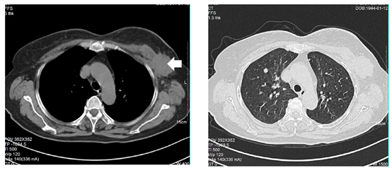 胸部CT:两肺多发类结节,考虑转移瘤。附见:左乳肿块;左锁骨上、双侧腋下淋巴结肿大,考虑恶性肿瘤,请结合专项检查。