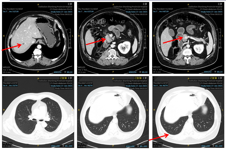 2025年6月27日 随访CT诊断意见:1. 近右侧膈肌脚、腰大肌处软组织肿块转移治疗后,较前缩小;2. 肝内及胰头区转移瘤治疗后,较前缩小;3. 双肺多发小结节,较前明显减少、缩小。根据RECIST 1.1标准,疗效评估为部分缓解(PR)。