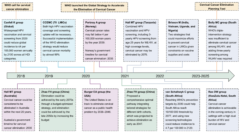 图1 宫颈癌消除关键建模研究与WHO里程碑事件的时间轴