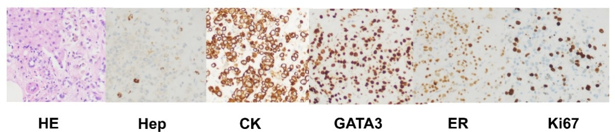 肝脏肿物穿刺病理:肝组织中见少量异型细胞呈巢状、条索状排列,可见核分裂象。IHC:Hep(-)、CK(+)、GATA-3(+)、ER约90%强(+)、Ki67约50%(+),诊断为分化差的癌,考虑为乳腺浸润性癌转移。