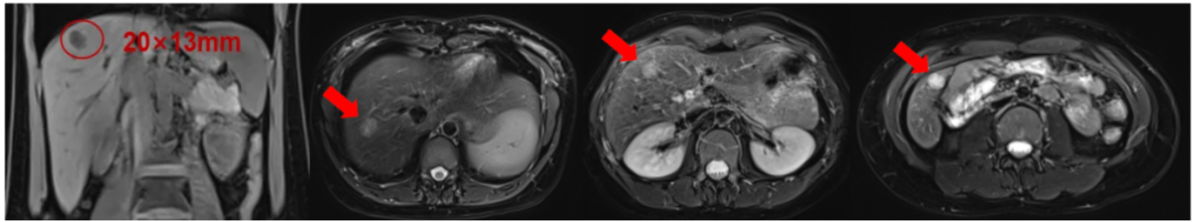 上腹部MR:肝脏多发占位(最大者位于S7,大小约20mm×13mm),考虑转移瘤可能性大。