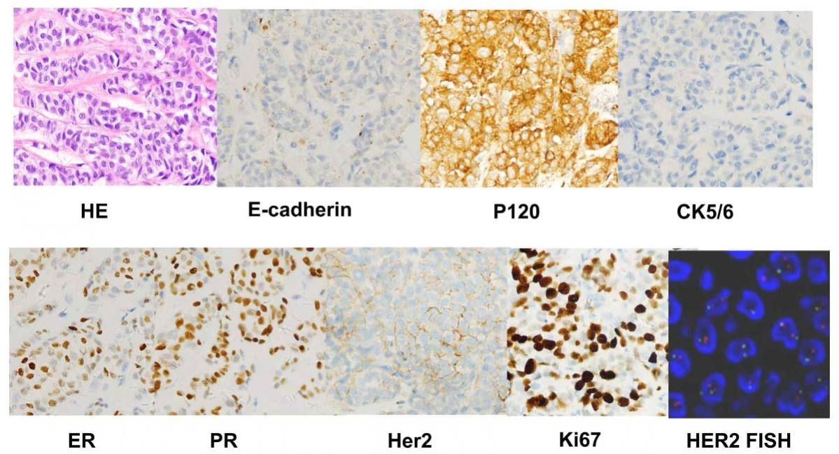 右乳肿物穿刺病理:(右)乳腺浸润性小叶癌。IHC:GATA-3(+),E-cadherin(-),P120细胞浆(+)、CK5/6(-)、ER约80%中-强(+)、PR约80%中-强(+)、Her2(2+)、Ki67 70%(+),HER2 FISH(-)。