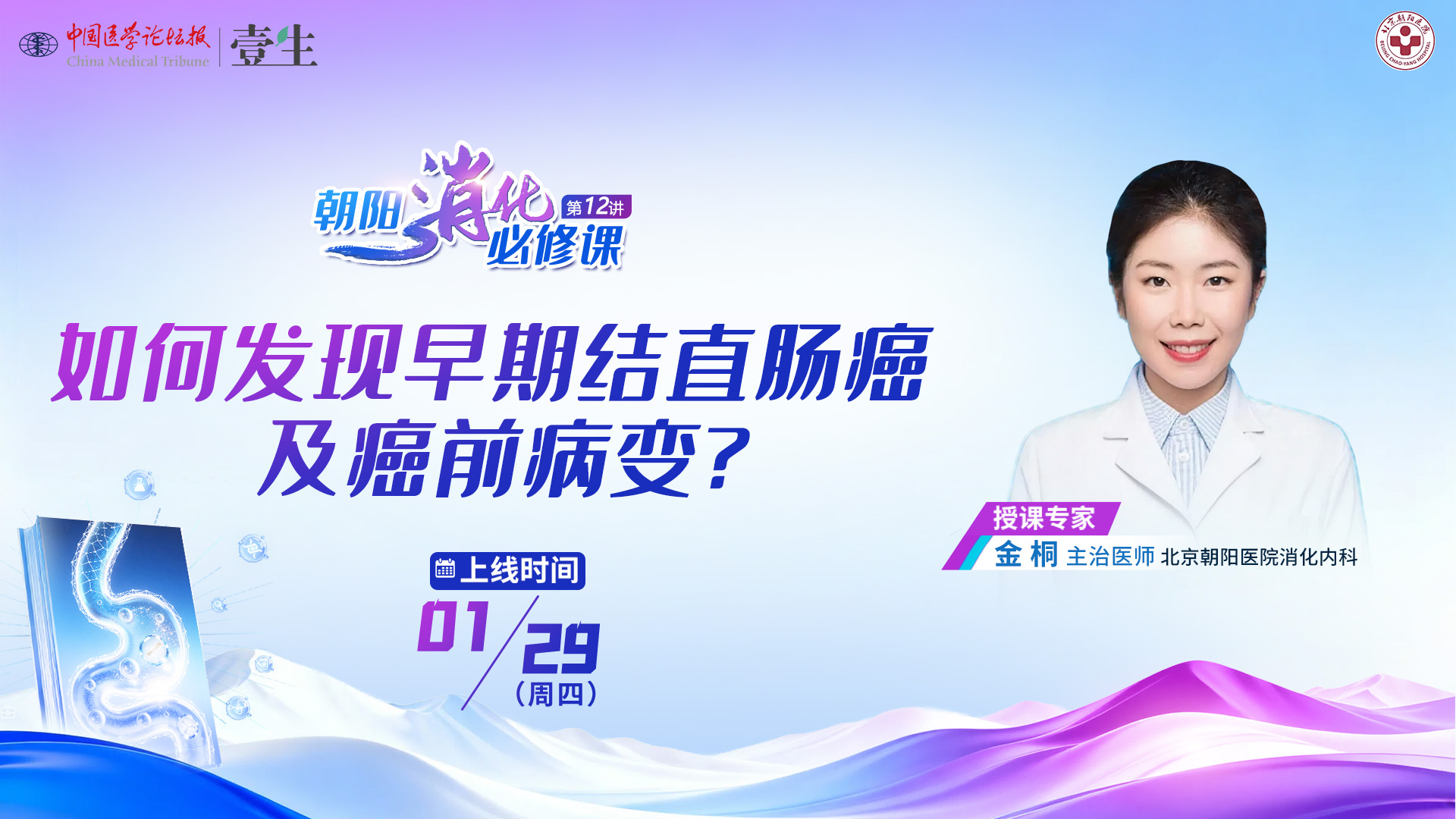 系列课背景壹生消化学院特别邀请首都医科大学附属北京朝阳医院消化内科副主任于剑锋主任医师,精心策划了《朝阳消化必修课》栏目,涵盖消化疾病指南解读、消化内镜指南精粹分享、内镜实战操作经验面对面模块,旨在通过消化疾病及消化内镜的指南学习与实践,助力各位消化医生,在新的一年里实现专业技能质的飞跃。系列课隔周周四更新1期,欢迎关注。第12期如何发现早期结直肠癌及癌前病变?上线时间1月29日(周四)授课专家金桐 主治医师北京朝阳医院消化内科课程详情