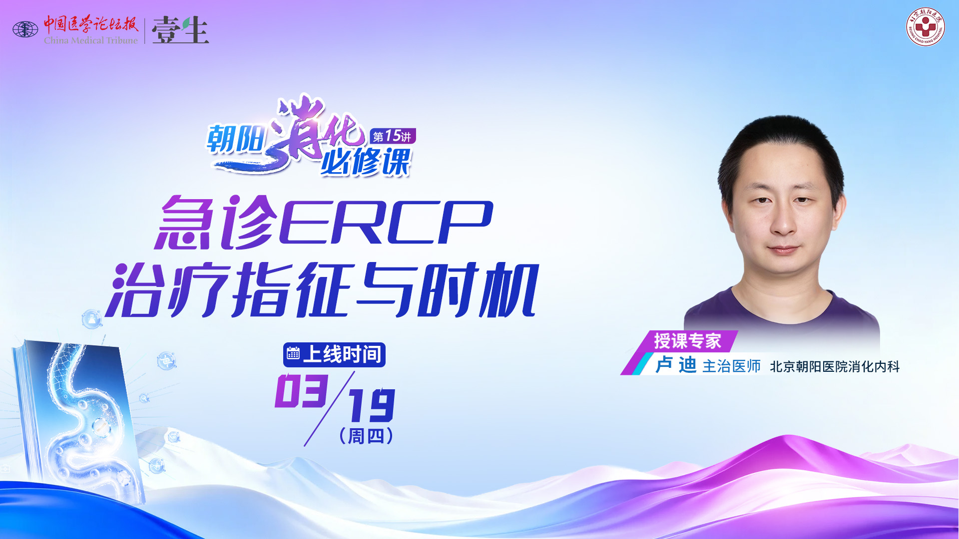系列课背景壹生消化学院特别邀请首都医科大学附属北京朝阳医院消化内科副主任于剑锋主任医师,精心策划了《朝阳消化必修课》栏目,涵盖消化疾病指南解读、消化内镜指南精粹分享、内镜实战操作经验面对面模块,旨在通过消化疾病及消化内镜的指南学习与实践,助力各位消化医生,在新的一年里实现专业技能质的飞跃。系列课隔周周四更新1期,欢迎关注。第15期急诊ERCP治疗指征与时机上线时间3月19日(周四)授课专家卢迪 主治医师北京朝阳医院消化内科课程详情